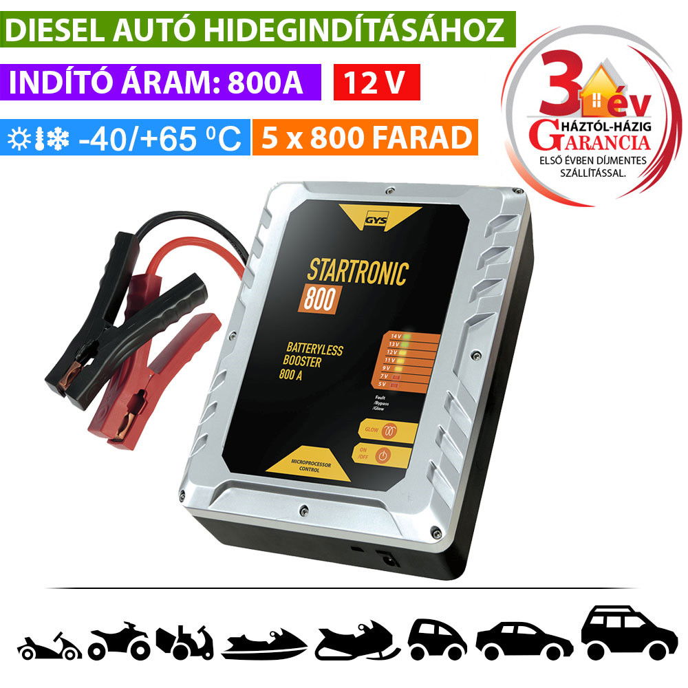 A STARTRONIC 800 intelligens, akkumulátor nélküli töltőt a 12 V-os járművekhez tervezték. A szuperkondenzátorokkal felszerelt eszköz a jármű akkumulátorának fennmaradó feszültségét használja önmaga feltöltéséhez és a motor néhány másodperc után történő elindításához. A hálózati feltöltés nem szükséges.
